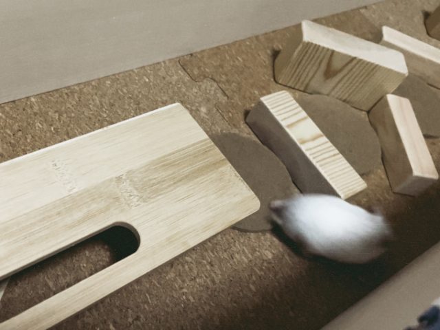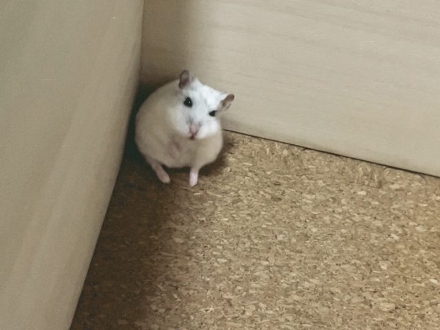 洞窟の入り口から首だけ出して、齧り木をカムカムしていました。まるで探検先の様子をうかがうように。でも、設計おじさんに「ズボラだね」と言われてしまいました。ハクは、ちょっとムキっとしました。そんなことないです。これは、ハムスター流の省エネ探検なのです。けれど、言い訳しても仕方ないので、ちゃんと外に出てカムカムを続けました。