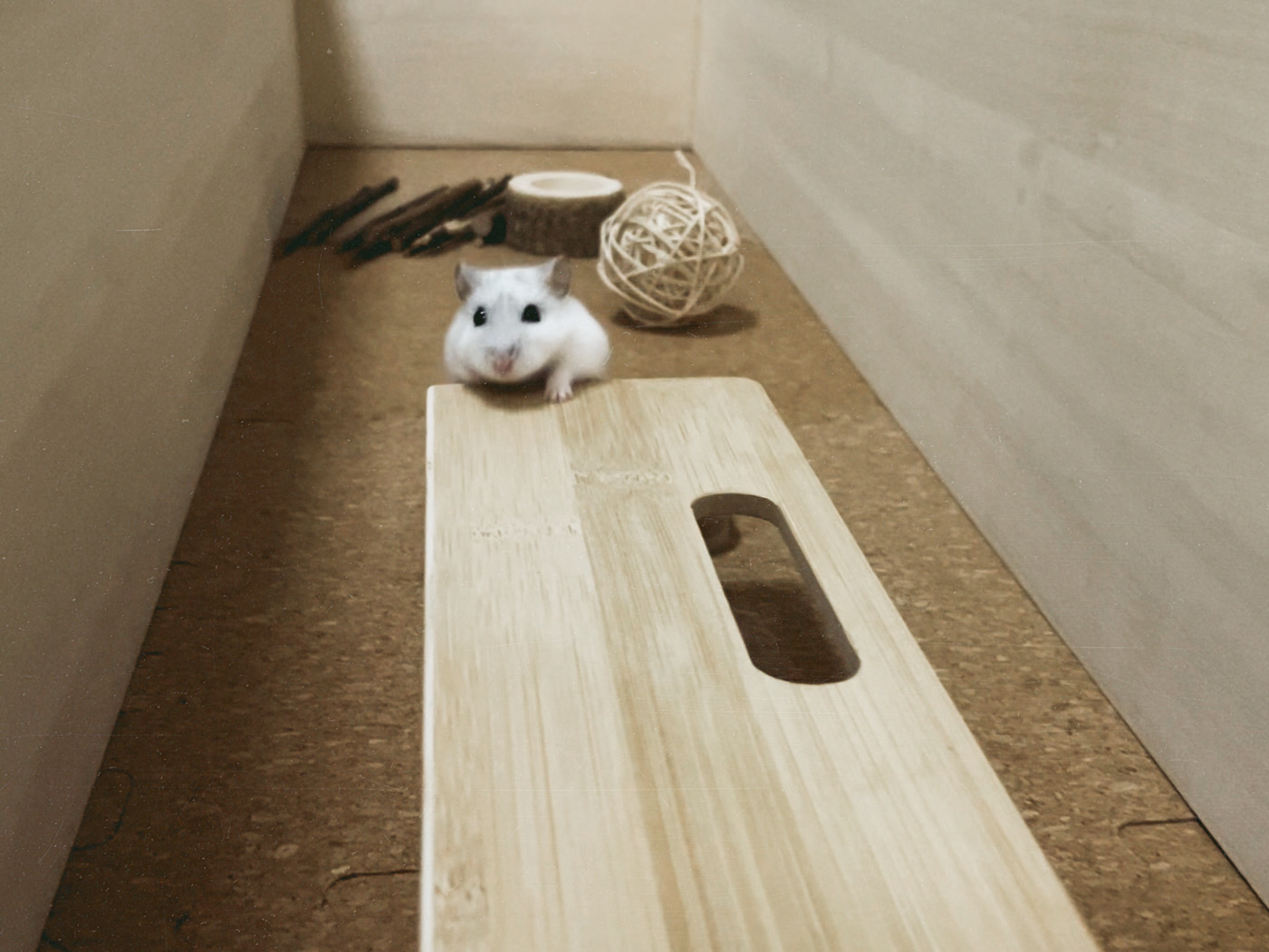 今日はお昼間、とても静かで心地よい時間が流れていました。エアコンがちょうどいい温度に保たれていて、地下のお部屋はふんわりと暖かく、ハクはすっかり安心して眠ってしまいました。これは、設計おじさんと洗濯おばさんが毎日、温度管理をしてくれているおかげです。そんなふたりの生活音を聞きながら目を覚ますと、今日は設計おじさんがまた長めのお昼寝をしている様子。どうやら背中が痛いようで、寝返りをうつたび、少し苦しそうにしています。その姿を見て、ハクはひとつ思いつきました。——ハクが背中を駆け回って、肩揉みをしてあげましょうか。遺伝子先生の教えによると、ハムスターの足裏は意外と柔らかく、細かい力加減が得意なのだそうです。野生では砂地の起伏を敏感に感じ取るためで、軽い刺激を与える動きは実は得意分野なのだとか。だから、ハクのちいさな足で駆け回れば、きっと優しい指圧みたいになるはずです。設計おじさん、どうでしょう。ハクの肩揉みサービス、けっこう効きますよ。