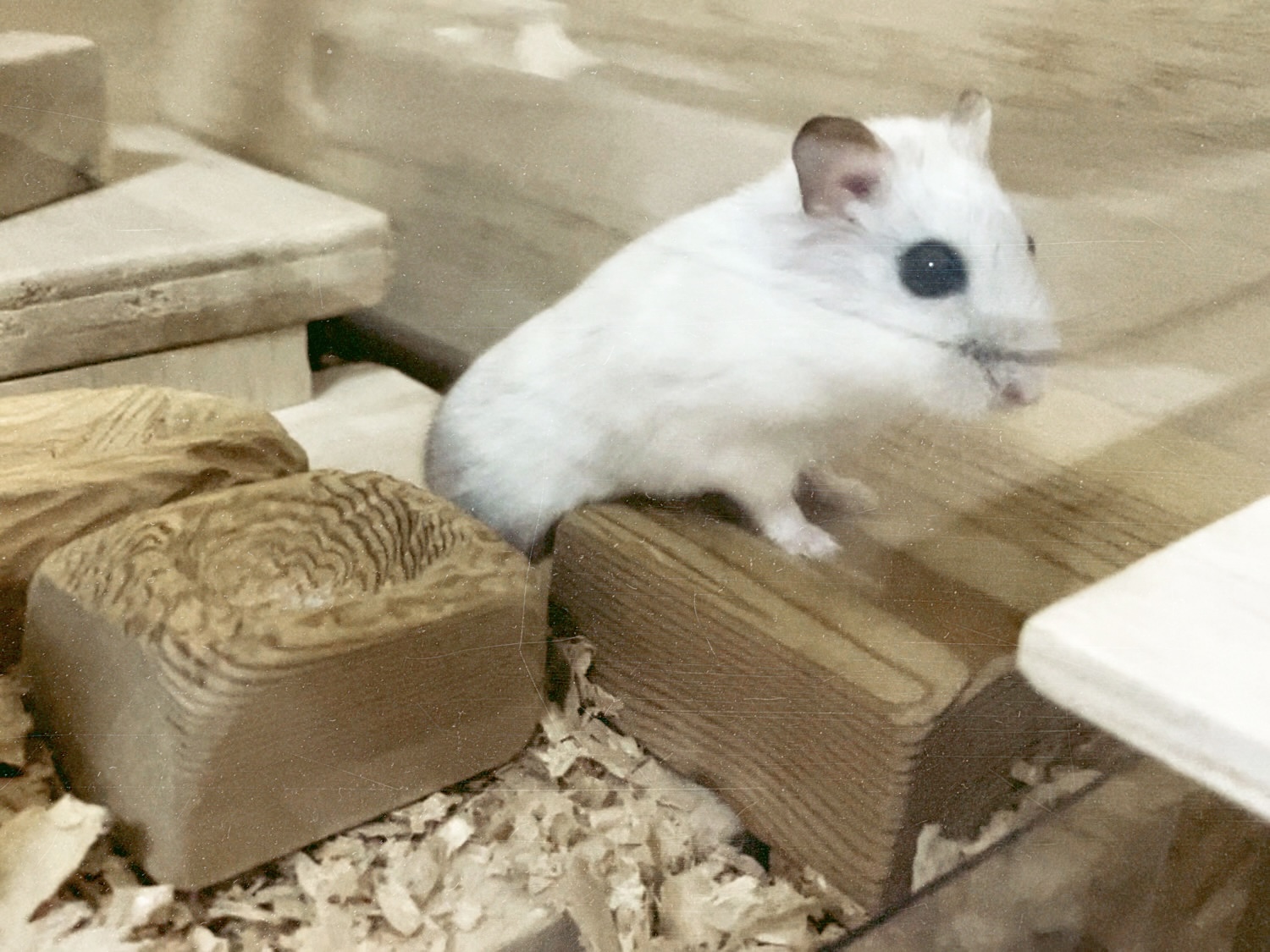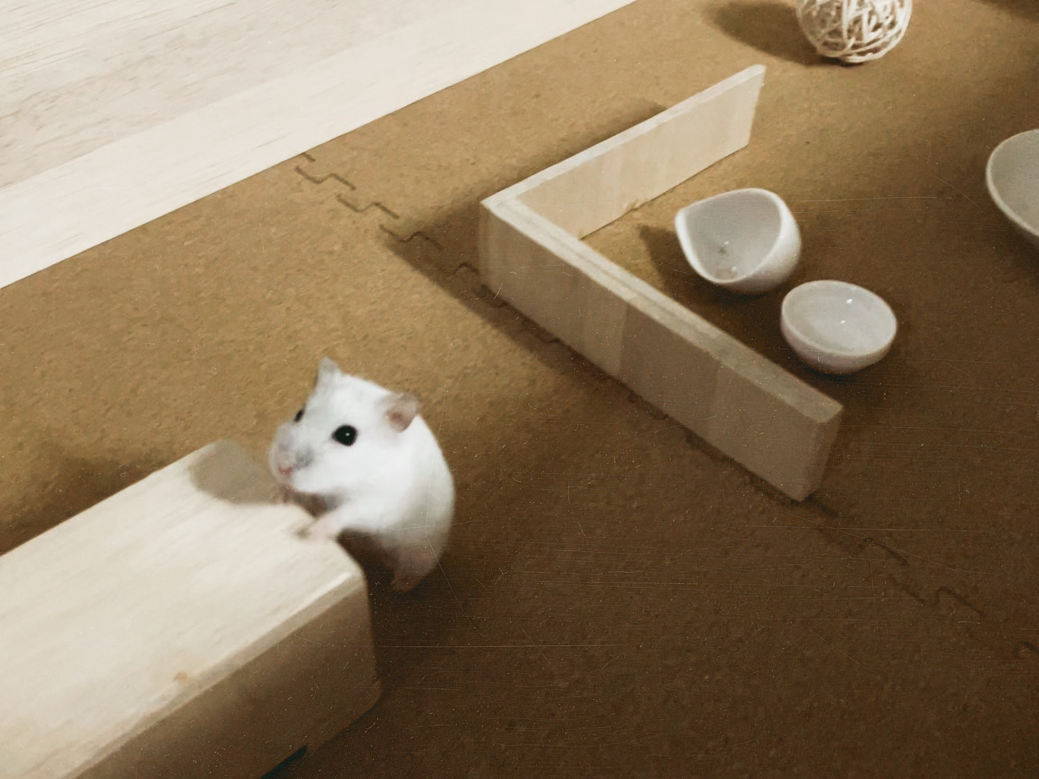 ここまでは、とてもよい話です。しかし問題は、夜に起きました。晩ごはんが餃子だったのです。餃子の餡を包む設計おじさんは無心状態です。キッチンから、ニラの香りがお外を通って、じわじわと広がってきました。ハクのお部屋にも、その気配がしっかり届きます。遺伝子先生の教えでは、ハムスターはとても嗅覚が発達している動物です。匂いは、環境を判断する大事な情報源です。食べ物の気配。危険の気配。仲間の存在。それらを鼻で読み取って生活しています。